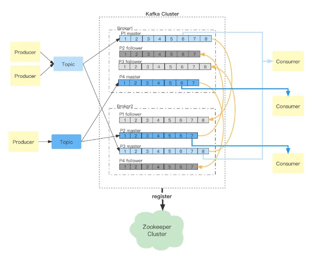 第一个 topic 有两个生产,新消息被写入到 partition 1 或者 partition 2,两个分区在 broker1、broker2 都有备份。有新消息写入后,两个 follower 分区会从两个 master 分区同步变更。对应的 consumer 会从两个 master 分区根据现在 offset 获取消息,并更新 offset。第二个 topic 只有一个生产者,同样对应两个 partition,分散在 Kafka 集群的两个 broker 上。有新消息写入,两个 follower 分区会同步 master 变更。两个 Consumer 分别从不同的 master 分区获取消息。