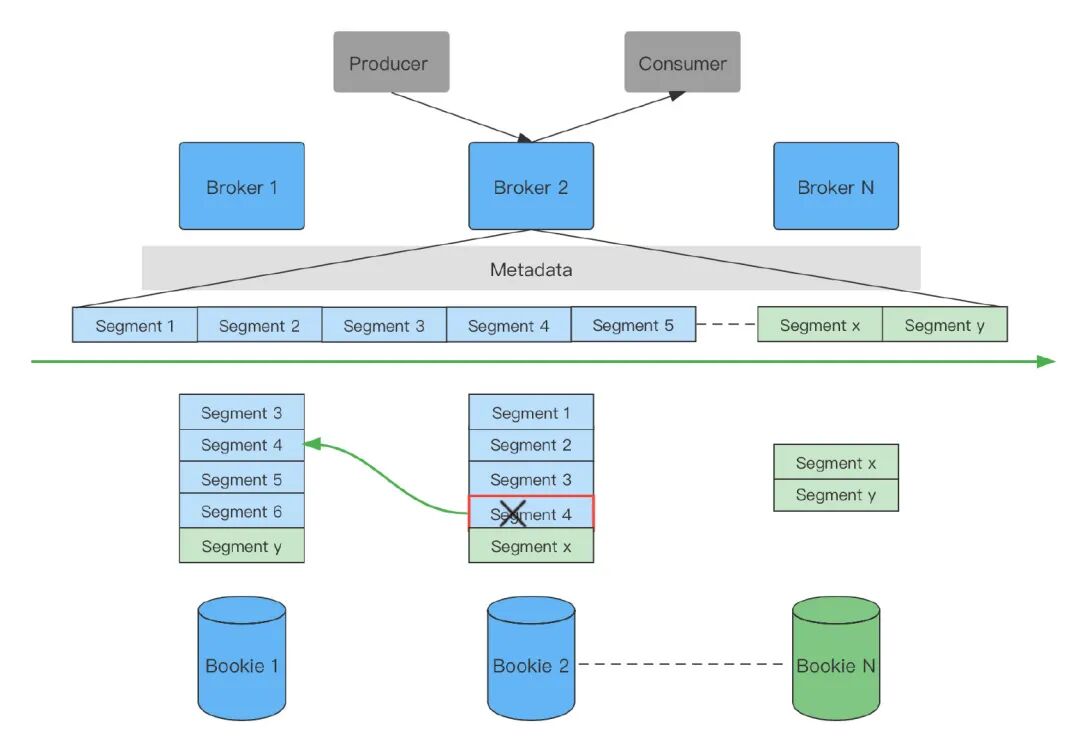 上面框架图分别演示了扩容、故障转移两种情况。扩容:因业务量增大扩容新增 Bookie N,后续写入的数据 segment x、segment y 写入新增 Bookie 中,为保持均衡扩容结果如上图绿色模块所示。故障转移:Bookie 2 的 segment 4 发生故障,Pulasr 的 Topic 会立马从新选择 Bookie 1 作为处理读写的服务。