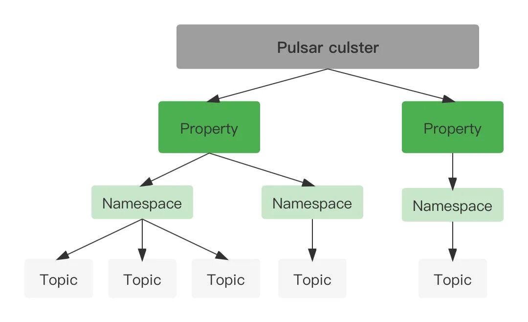 Namespace:Pulsar 的基本管理单元,在 namaspace 级别可设置权限、消息 TTL、Retention 策略等。一个 namaspace 里的所有 topic 都继承相同的设置。命名空间分为两种:本地命名空间,只在集群内可见、全局命名空间对多个集群可见集群命名空间;