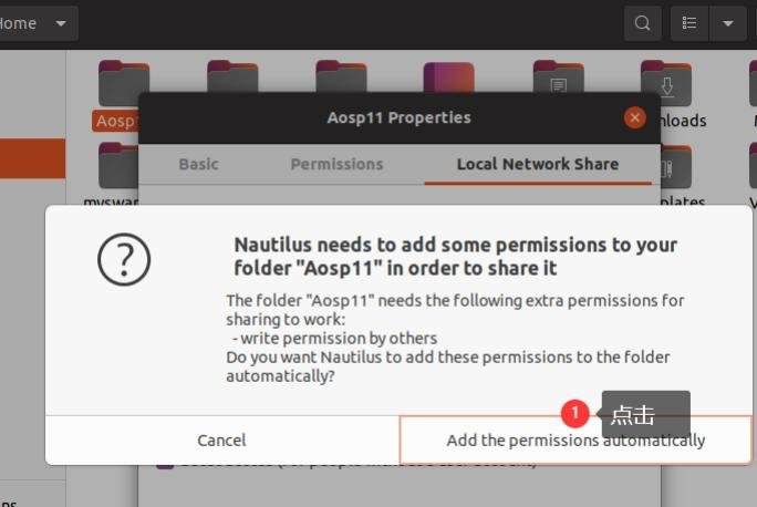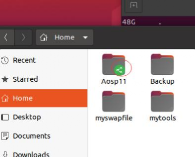 在Utuntu系统中找到源码保存目录Aosp11,依次按照如下图示操作创建Aosp11共享目录。如下图所示: