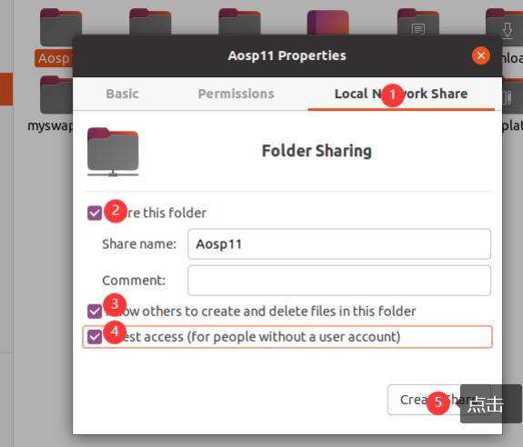 请按照图中序号依次点击。点击5之后如果Ubuntu系统未安装samba服务,会提示安装samba服务。安 装成功之后才能正常创建共享文件夹。