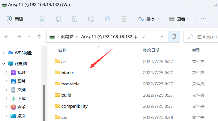映射成功之后可以看到源码目录了。同时打开此电脑中可以看到网络位置的地方显示了ubuntu映射过来 的共享文件夹Aosp11