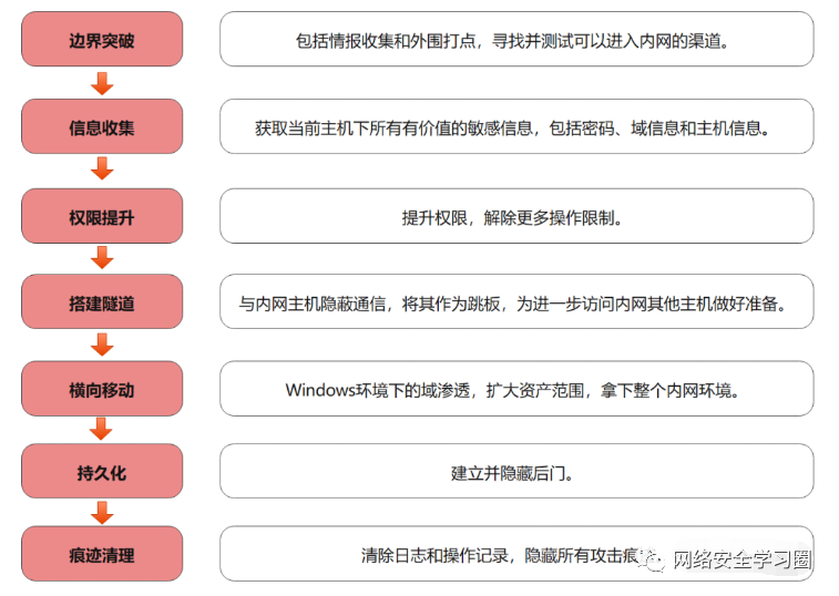 渗透测试的目标可以是单个主机,也可以是整个内网。在实战中,比如最近如火如荼的HW行动,更多的是对一个目标的内网进行渗透,争取获得所有有价值的资产。完整的内网渗透涉及的步骤如下图所示。我们总是先通过对外提供服务的,防守最薄弱的主机打进去,然后搭建隧道,通过该主机访问内部的其他主机。快速横向移动到到内网中的核心资产,获取核心敏感数据和权限,完成一次疼痛的打击。