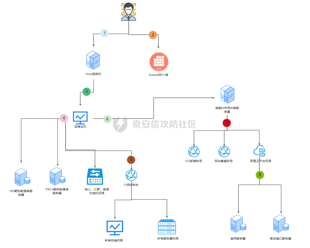 下面我会按照上面图上标记的序号说明内网攻击过程