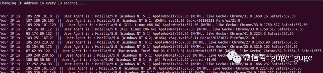 代码将每10秒生成一个新IP地址,并在每个请求中生成一个新的用户代理。