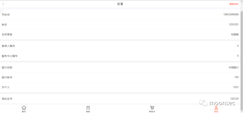 这个就是用户信息,好像是没有什么可以利用的,除了手机号码,身份证、银行卡是我添加的