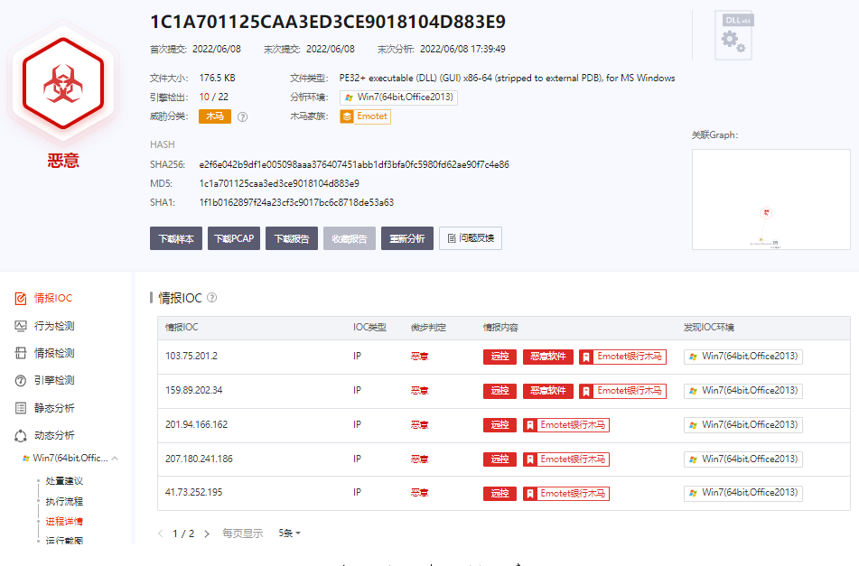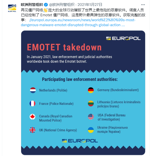 2021年11月,由欧洲刑警组织捣毁的Emotet僵尸网络卷土重来,以极快的速度恢复且初具规模,重新对外提供恶意软件分发服务。根据监测,近几个月来Emotet感染活动非常活跃,不断升级病毒组件,并针对日本地区进行了重点攻击,也由此波及了部分关联的中国企业。微步情报局对Emotet僵尸网络的背后团伙、攻击事件及手法、资产通信进行了深入的分析,目前主要的结论如下: