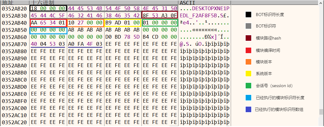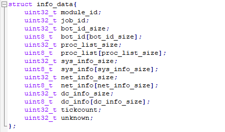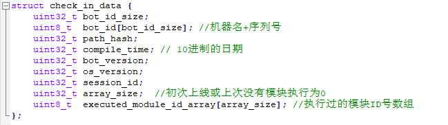 转移后的Emotet启动执行后会收集主机基础信息定时向C2发送上线请求(请求命令号为1),包括Bot标识名、模块路径hash、当前模块的编译时间,系统版本等。另外在Emotet接收执行模块后,在下次的请求中会带入这些模块的ID号,用于确认模块执行成功,从而C2推送其他新的模块执行。上线数据的结构及实例如下: