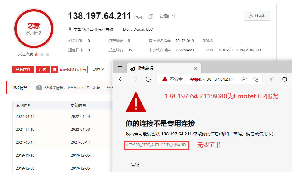 使用失陷站点作为C2服务器,只使用IP地址+端口的形式进行访问,不使用域名,常在80、443、8080等端口架设HTTPS服务,证书为非法证书且不是用于网页服务;