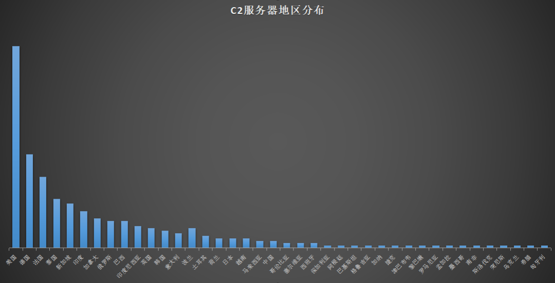 微步情报局通过对该僵尸网络通信协议的详细分析并进一步依赖于自有的网络空间测绘系统对全网进行的分析,累计发现了上千台Emotet活跃的主控服务器,位于美国的最多,德国、法国次之。