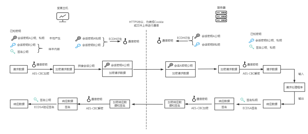 Emotet主模块及下发的子模块均相同的协议(HTTPS + ECDH(NIST256p))与C2服务器进行通信,即在HTTPS协议的基础上又做了一层加密。病毒作者对该协议封装良好,使用该协议时,只需要提供请求的命令号以及对应的数据,即可完成整个通信过程。