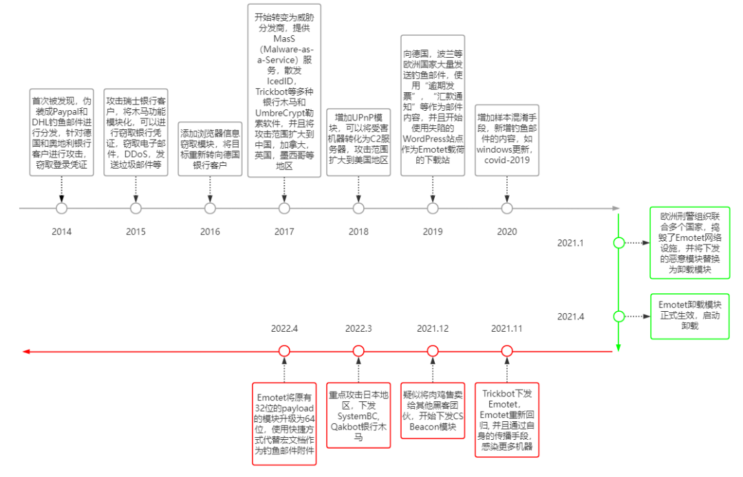 Emotet家族木马在2014年首次出现,开始时作为银行木马,攻击德国银行客户,通过窃取的银行登录凭证,直接窃取受害者财产。后来经过黑客组织的长期运营,由钓鱼邮件散播的木马构建了庞大的僵尸网络,盈利方式逐步转变为直接售卖肉鸡和提供威胁分发服务。随着木马对抗技术的升级和僵尸网络的不断扩大,Emotet逐渐演变成为最具威胁的木马,影响的地区遍布全球,分发的Trickbot银行木马、Ryuk勒索病毒等破坏了正常的生产生活,也造成巨大的财产和经济损失。在2021年1月,欧洲刑警和德国,乌克兰等多个国家联合组织行动,捣毁了Emotet的基础网络设施,宣告运营7年之久的僵尸网络结束。然而平静仅持续了10个月左右,Emotet借由Trickbot木马卷土重来。