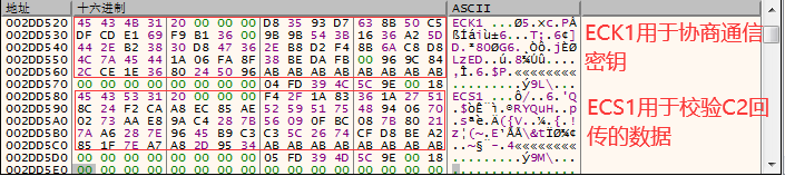 样本中内嵌了两个异或加密后的ECC公钥ECK1、ECS1,分别用于生成通信密钥和校验回包数据。