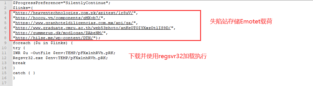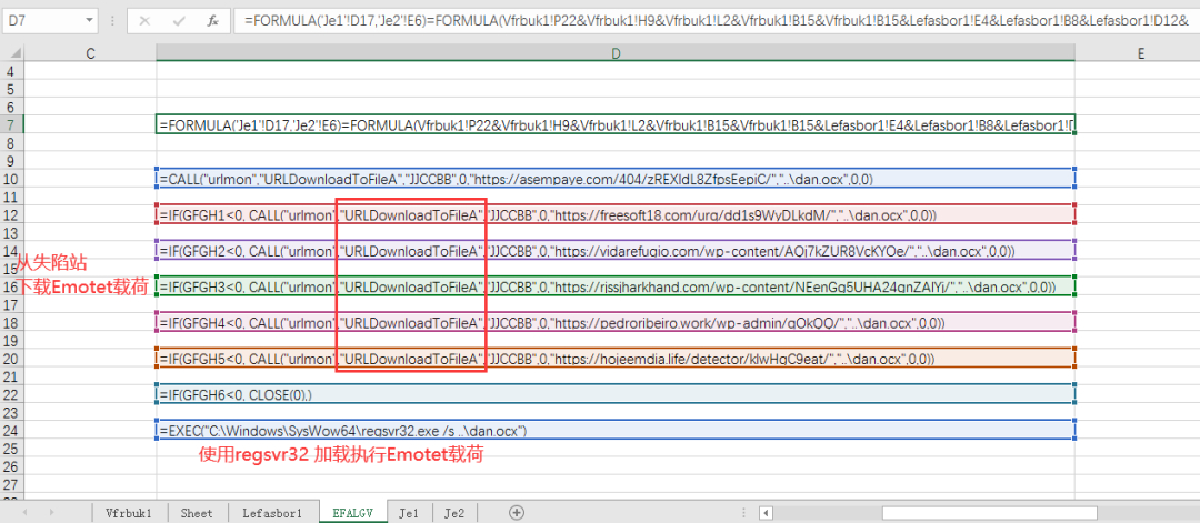 宏代码被拆分在不同的工作表中,并将颜色设置为白色来隐藏。执行时使用FORMULA函数把打散的代码重新拼接到宏表的单元格中,按照从上到下的顺序依次执行。宏脚本主要负责从存储Emotet载荷的失陷站上下载Emotet动态链接库(DLL文件),使用Regsvr32加载执行。3.2.1 C2和通信协议