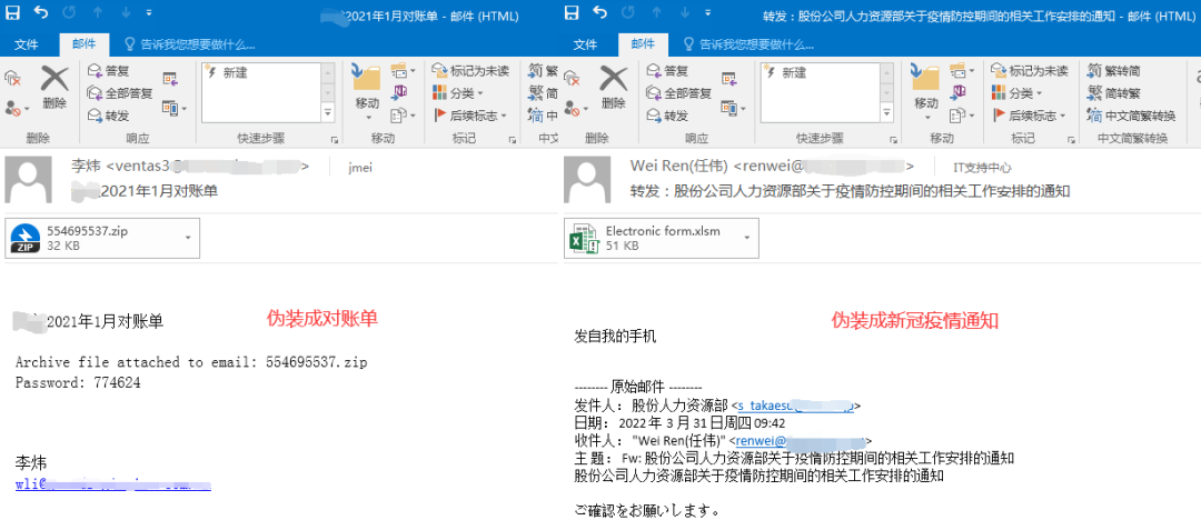 Emotet主要通过钓鱼邮件传播,钓鱼邮件的内容一般为收款单、节日祝福、新冠疫情通知等。