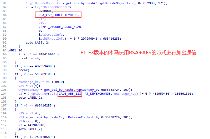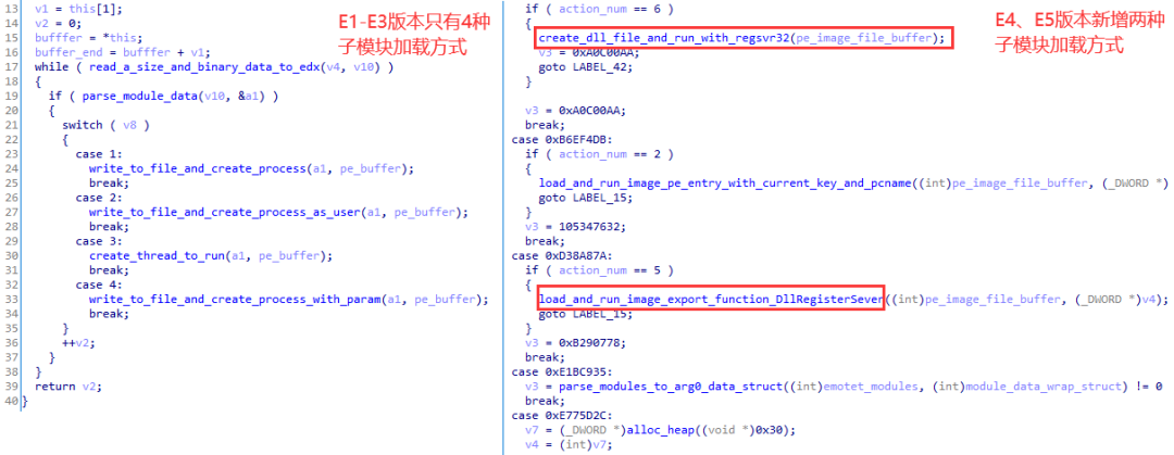 对比在欧洲警方捣毁前的E1-E3版本的木马样本来看,现在活跃的E4-E5版本的样本基本延续使用了前版本的多处代码,比如基本混淆方法、字符串加密算法、API名称Hash算法、上线信息等与之前的一致。修改最为明显的是木马通信协议的改变,在E1-E3版本时使用RSA+AES的方式加密通信的内容,而E4-E5版本选择使用ECC+AES的方式进行。对于子模块的加载方式,Emotet也做了调整,新增了两种针对DLL形式载荷的加载方式。![]()