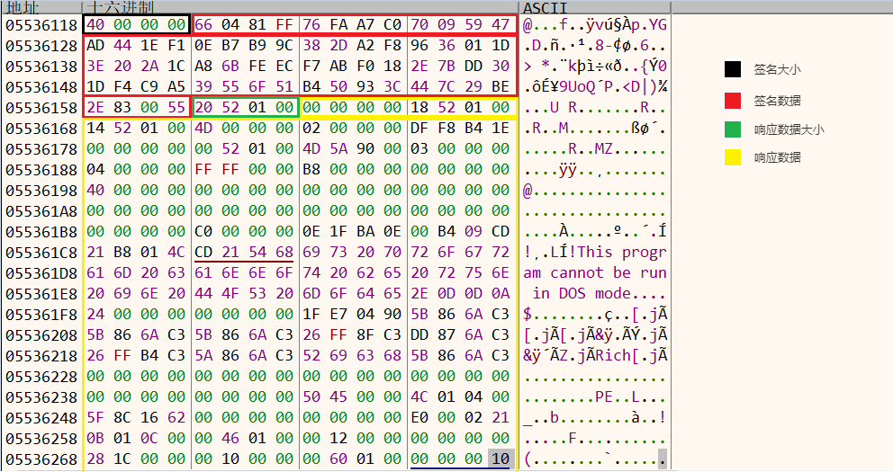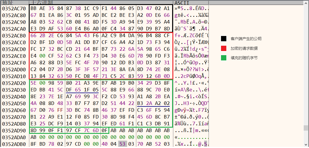 将得到的命令数据用通信密钥使用AES-CBC算法加密得到加密命令数据,并将客户端公钥拼接在头部,在尾部添加随机字节,生成最终请求的数据(随机字节特殊处理,可以通过尾部找0x00后对齐字节的方式去掉)。请求数据的结构及实例如下: