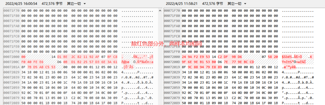 Emotet木马具有成熟的免杀方案,对于主模块和下载执行的子模块均会添加随机字节改变样本哈希。以两次下发的同一子模块对比为例: