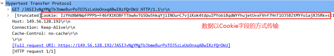 生成请求数据后,使用HTTPS协议向C2服务器的随机名URI发送请求,并且根据数据大小不同选择不同的请求方式。如果数据包小于1KB,则将数据base64后放到HTTP头中的Cookie字段,以GET请求方式进行传送。