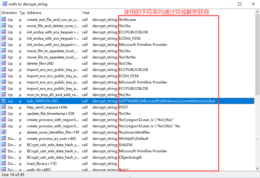 使用的字符串均异或加密存储,且在使用后会立刻释放对应的明文内存。