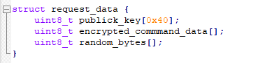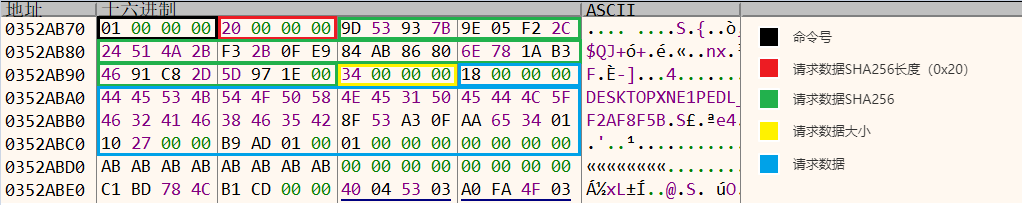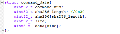 客户端产生自己的ECC密钥对,使用私钥和ECK1产生协商密钥,协商密钥通过SHA256哈希算法衍生出用于数据加密的AES通信密钥。同理,C2服务器端在接收到客户端的公钥后,也可以通过公钥和ECK1对应的私钥产生相同的通信密钥。客户端要发送的原始数据包含两个部分:请求的命令号和对应的数据,协议第一步首先对命令号和数据进行打包。将要发送的原始数据计算SHA256,并拼接命令号,得到要发送的命令数据,那么C2服务器端在收到后就可以根据哈希值校验数据的完整性。命令数据的结构及实例如下:
