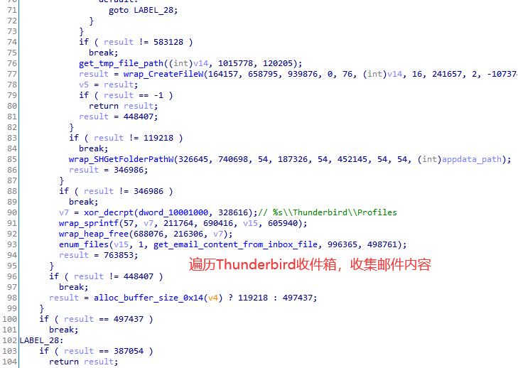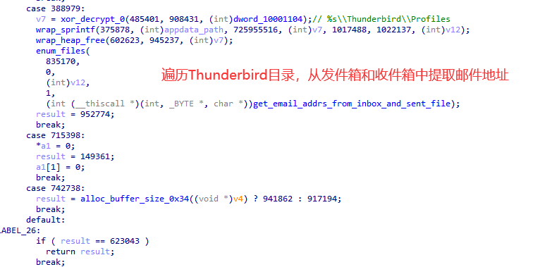 样本外层负责加载执行内部Outlook邮件内容收集模块,用于收集收件箱中的邮件内容,完成后写入到临时文件中。然后读取临时文件,将收集到的内容发送至服务器。该模块会遍历Thunderbird邮件客户端存储邮件的%APPDATA%\Thunderbird\Profiles目录,解析INBOX收件箱和Sent已发送邮件,提取联系人名和邮箱地址,发送至服务器。