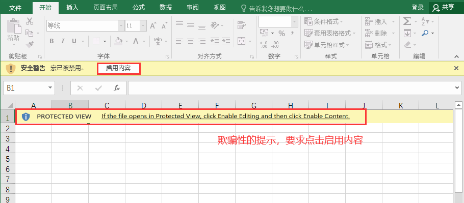 钓鱼邮件的附件中或链接指向的宏文档一般为欺骗性的提示内容,告诉用户文档处于保护视图,如果想要查看或编辑,需要点击启用内容按钮。一旦用户点击启用内容或者用户的Office软件默认启用宏,那么文档中的恶意宏代码便会执行。下面以一个带有MS Excel 4.0宏表的XLS文档为例: