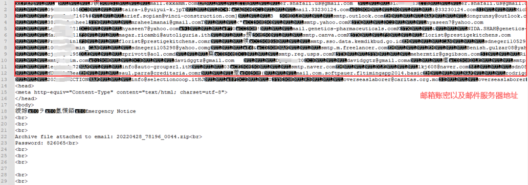 该模块向C2服务器请求垃圾邮件任务,服务器返回曾经窃取的邮件账密,目标邮箱,垃圾邮件内容等信息。