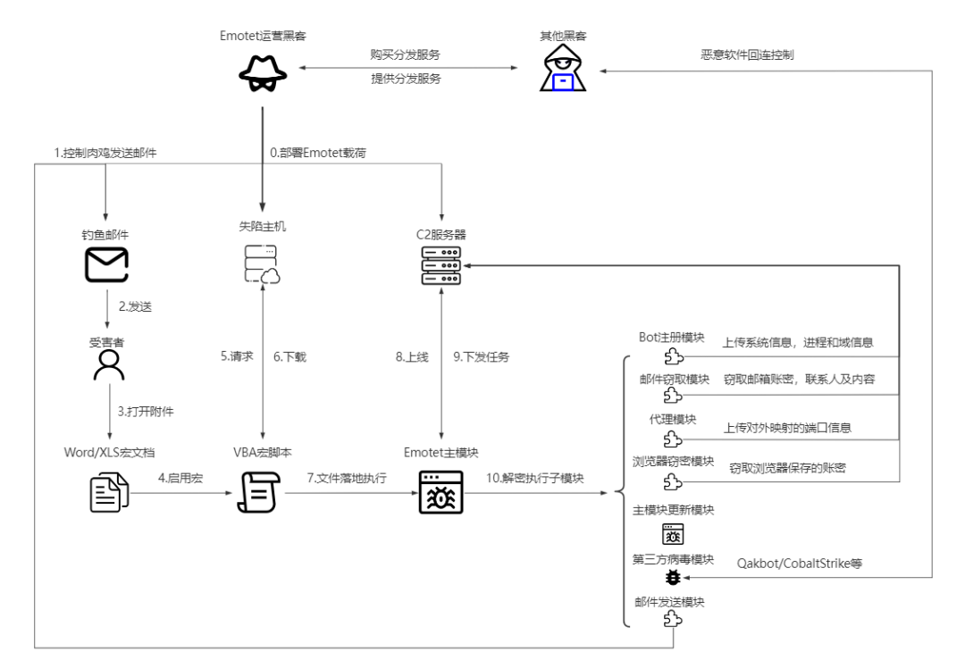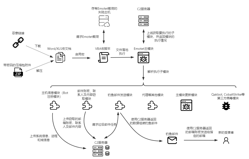 | 垃圾邮件模块 | 接收C2下发的垃圾邮件任务,给指定目标发送带有Emotet病毒的钓鱼邮件。 |