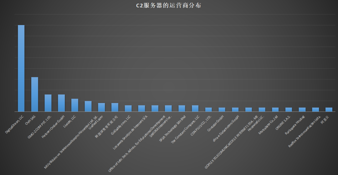 通过微步空间测绘技术可以得到全球的Emotet C2服务器列表,C2主要集中在欧州、美州和东南亚地区,这也与Emotet攻击的主要地区相吻合。具体分布如下图所示:Emotet C2服务器所在的运营商主要集中在DigitalOcean、OVH SAS、GMO-Z.COM和Hetzner Online GmbH 。Emotet架设回连控制的服务主要分布在8080和443端口上。因此Emotet在使用失陷站点(通常Web服务会占用443,80端口)架设服务时,会优先选择443端口。如果443端口被原有的Web站点占用,则选用8080端口。同样如果8080端口被占用,则选择7080端口,以此类推,直到找到可用端口。具体分布如下图所示: