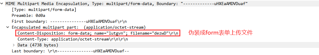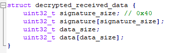 当数据大于1KB将数据伪装成表单提交文件的方式,以POST请求方法发送请求。发送请求后,会接收到的C2服务器的针对性的回应数据。首先使用通信密钥解密,并使用ECS1密钥对数据进行校验,校验通过后不同模块会根据自己的逻辑对数据进行处理,如解析其中的子模块,垃圾邮件信息等。数据结构及实例如下: