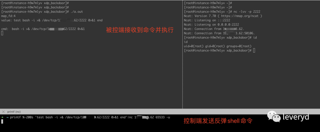 最终实现了的后门demo效果如下, 控制端通过udp协议和被控端单向通信,被控端从通信流量中提取出payload后执行命令。