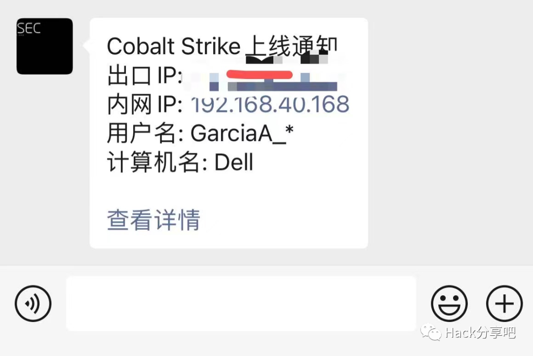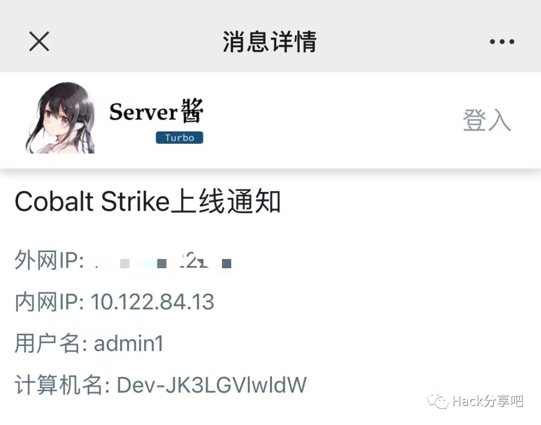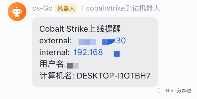 CobaltStrike上线通知插件,支持:飞书群聊机器人、server酱,大家也可以自己根据源码修改为短信、钉钉、企业微信、Telegram等。项目地址:https://github.com/r1i