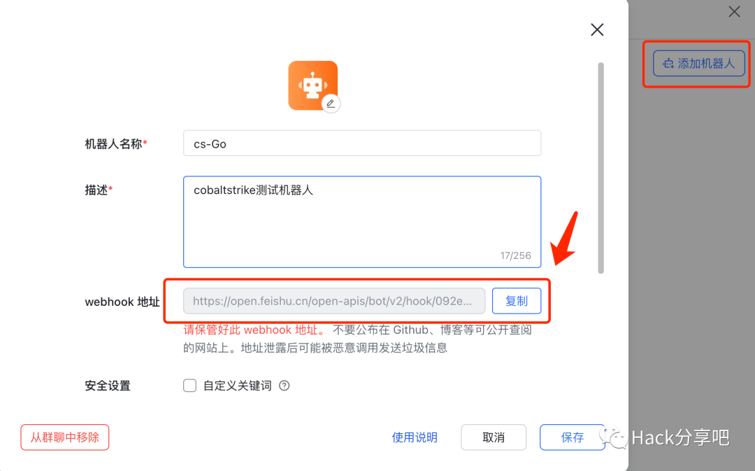在飞书中新建一个群聊,在群聊中添加一个群聊机器人。将其webhook地址复制,替换掉$feishu_url中的webhook地址