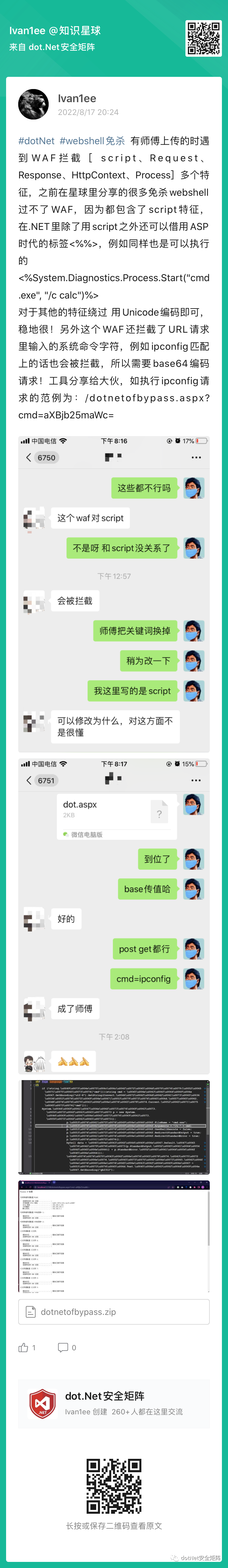 dotNet安全矩阵知识星球 — 聚焦于微软.NET安全技术,关注基于.NET衍生出的各种红蓝攻防对抗技术、分享内容不限于 .NET代码审计、 最新的.NET漏洞分析、反序列化漏洞研究、有趣的.NET安全Trick、.NET开源软件分享、. NET生态等热点话题、还可以获得阿里、蚂蚁、字节等大厂内推的机会。