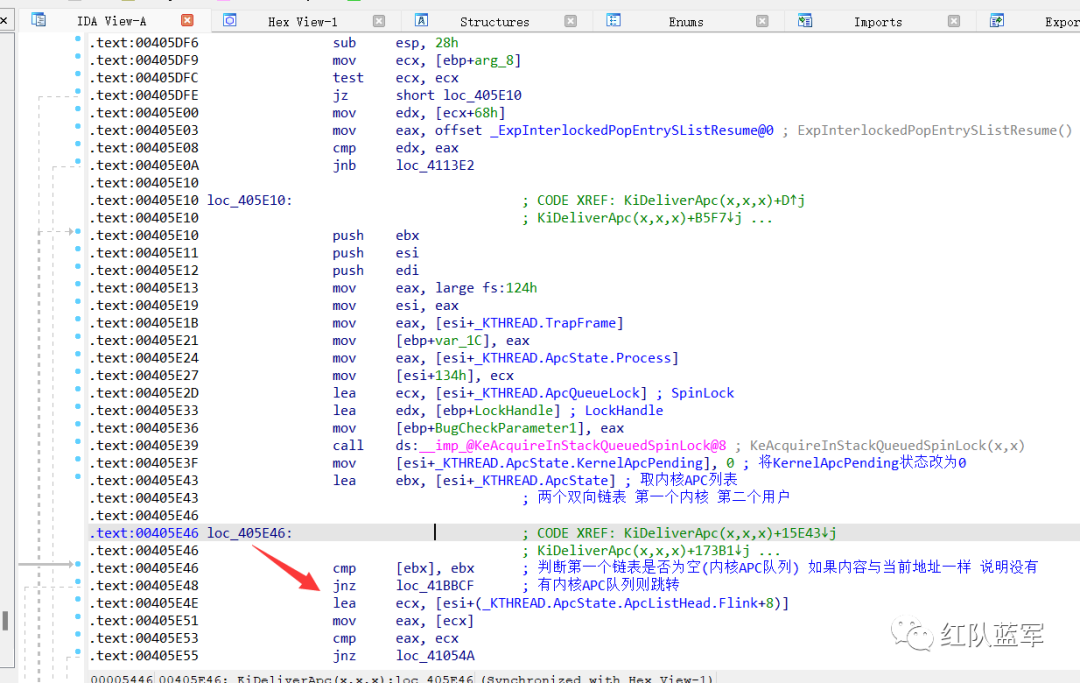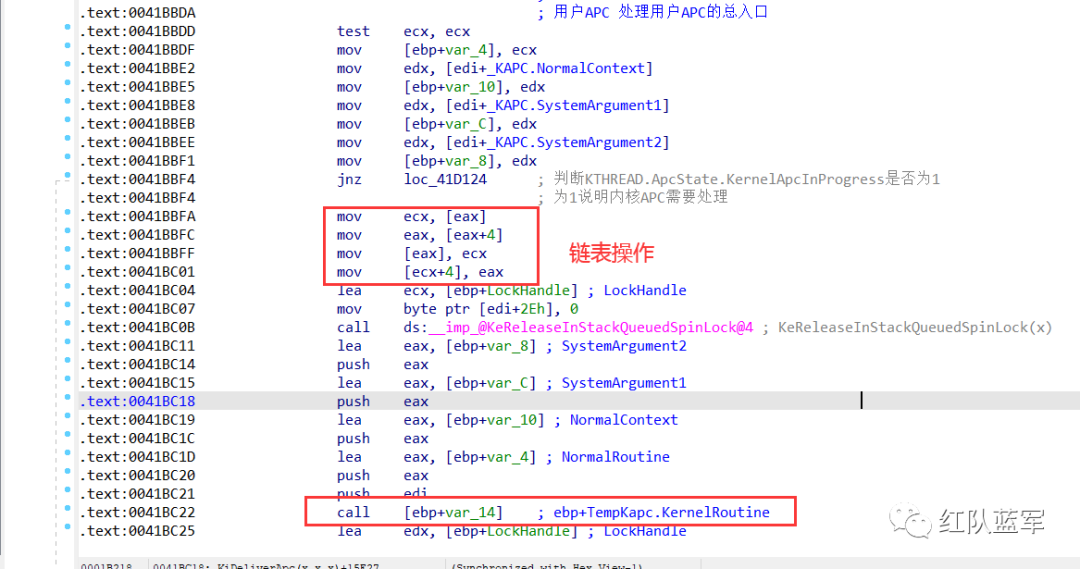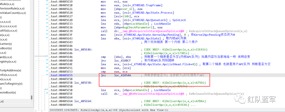 继续往里面跟,判断内核APC的链表是否为空,若不为空则跳转