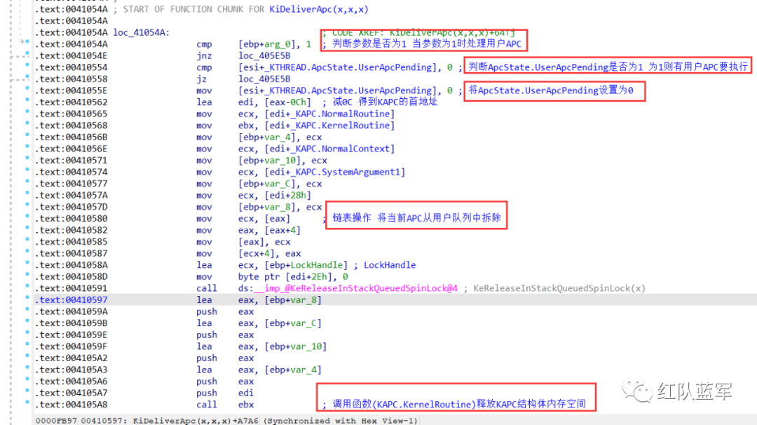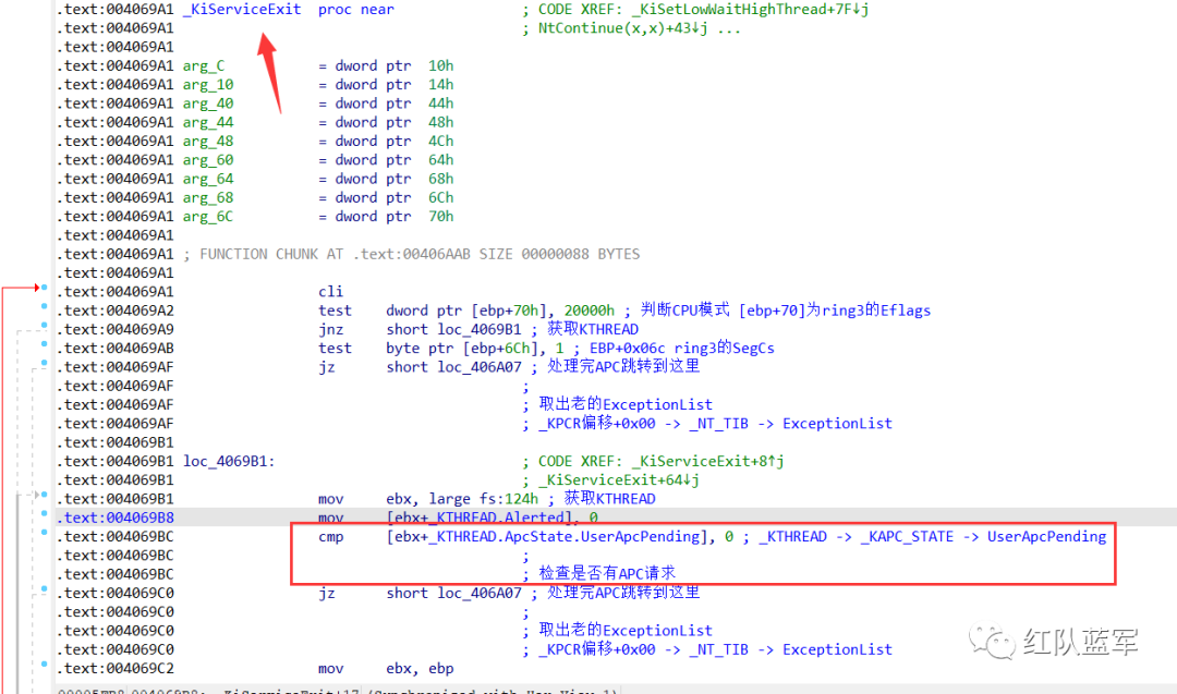 当要执行用户APC之前,先要执行内核APC,这里找到KiServiceExit,有一个比较检验UserApcPending的值是否有APC请求