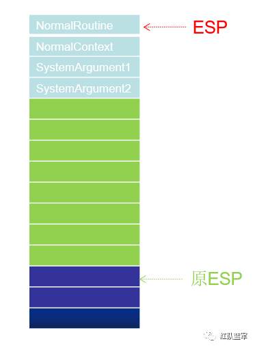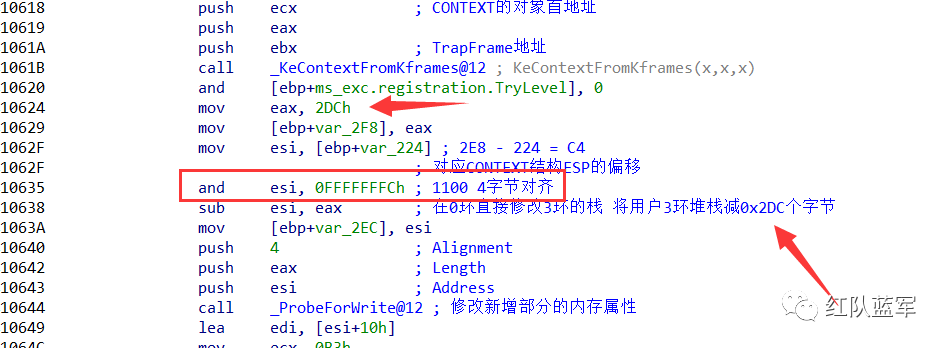 然后以4字节对齐将3环堆栈减去0x2DC个字节,这里是因为要将CONTEXT结构和KAPC的4个参数传给3环