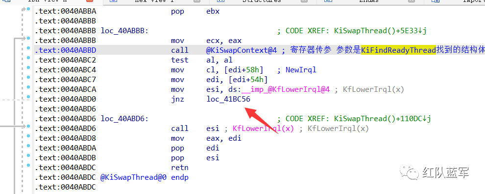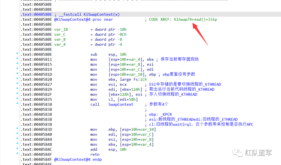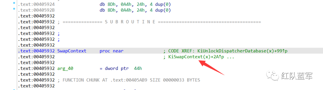 定位到SwapContext函数,然后查看KernelApcPending的值是否为空,不为空则跳转,这里只是进行判断,我们往上跟