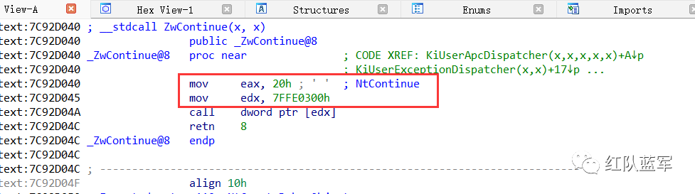 然后修改eip,这里永远返回一个固定的位置,但是这个位置在每次系统启动的时候都不相同,存放在3环的ntdll里的KiUserApcDispatcher参数里面