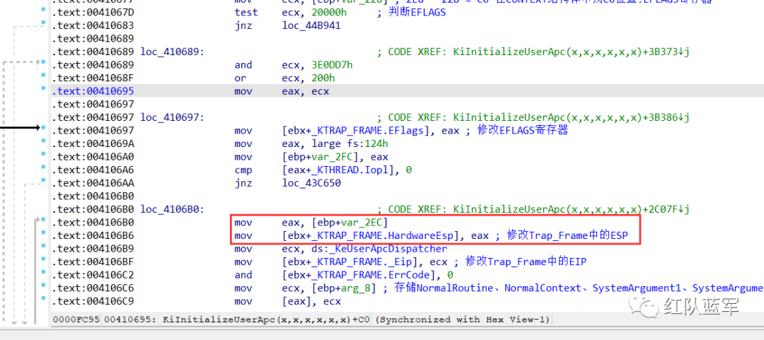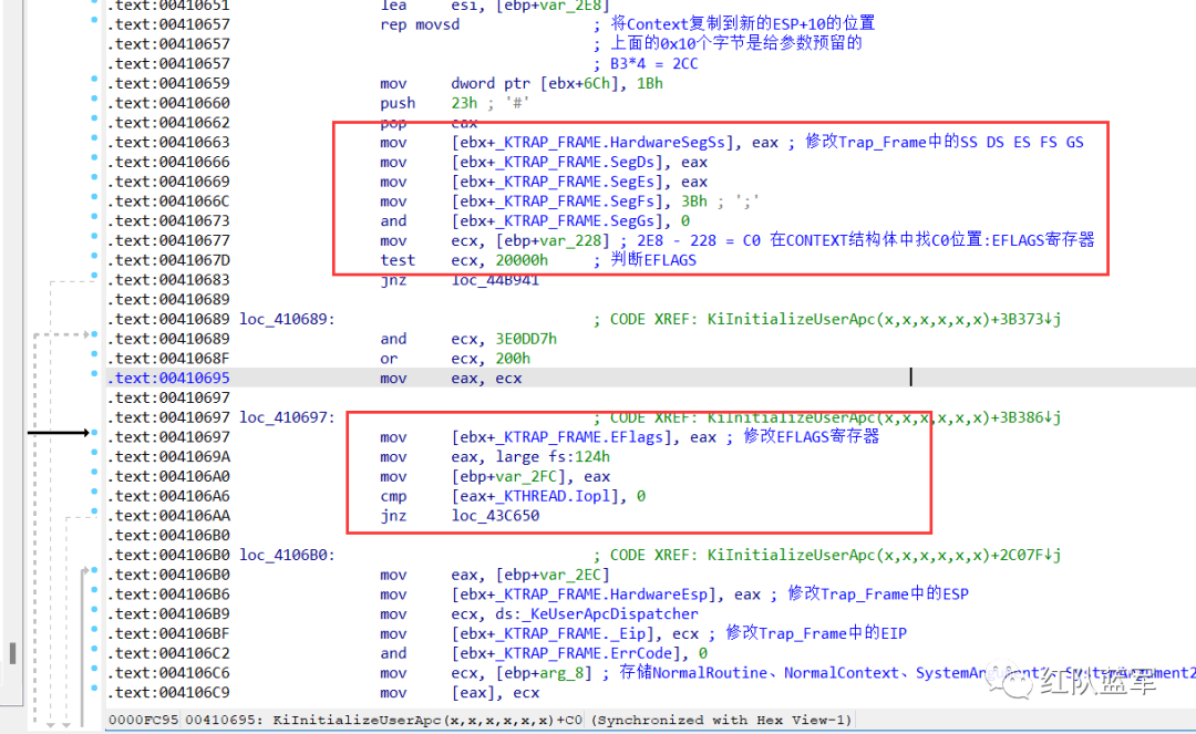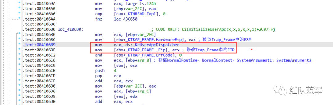 线程进0环时,原来的运行环境(寄存器栈顶等)保存到_Trap_Frame结构体中,如果要提前返回3环去处理用户APC,就必须要修改_Trap_Frame结构体: