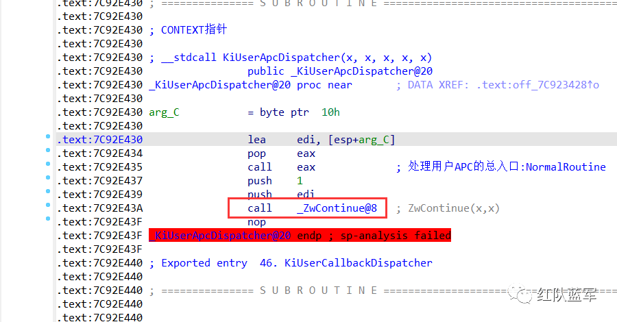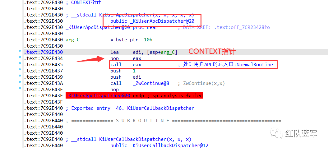 然后到ntdll里面定位到KiUserApcDispatcher,首先得到指向CONTEXT结构的指针,然后pop eax得到NormalRoutine结构,这里当APC是内核APC的时候存储的是真正的APC地址,当APC是用户APC的时候存储的是指向用户APC的总入口
