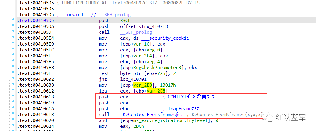 将原来_Trap_Frame的值备份到一个新的结构体中(CONTEXT),这个功能由其子函数KeContextFromKframes来完成,代码如下