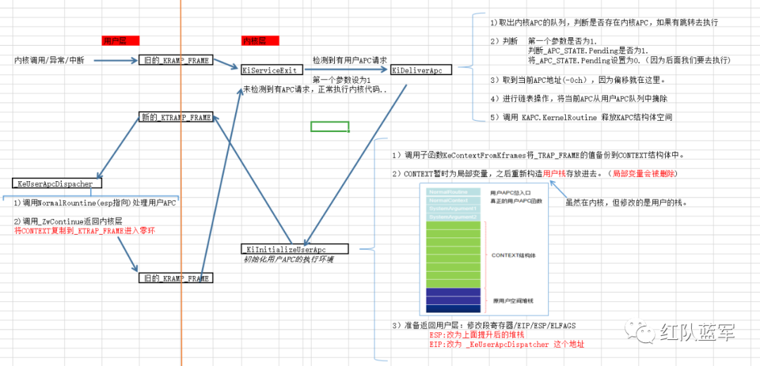 但如果有用户APC要执行的话,就意味着线程要提前返回到用户空间去执行,而且返回的位置不是线程进入内核时的位置,而是返回到其他的位置,每处理一个用户APC都会涉及到: