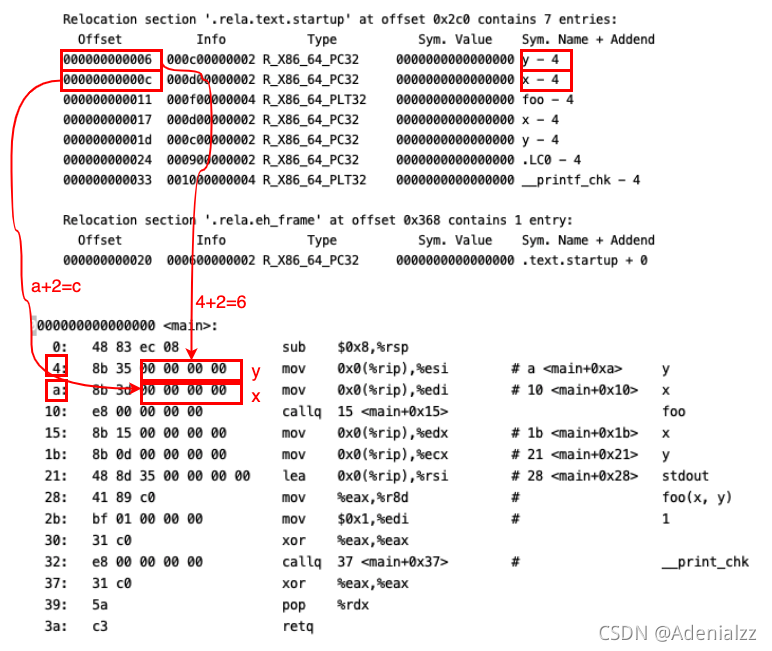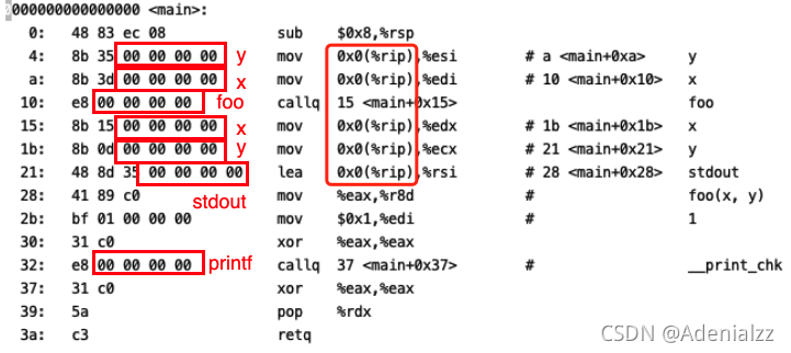另外注意这里的%rip相对寻址的偏移量都是0,一会儿我们会讲到,在静态链接完成之后,它们的偏移量会被填上正确的数值。