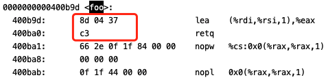 我们看到,foo函数在代码段的前四个字节的地址确是就是我们上面打印输出的c3 37 04 8d(注意字节序为小端法)。