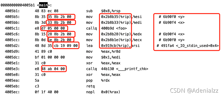 我们可以看到,之前填0留空的地方都被填充上了正确的数值,%rip相对寻址的偏移量以被填上了正确的数值,而且objdump也能够正确地解析出我们的外部符号名(最后一列)的框。