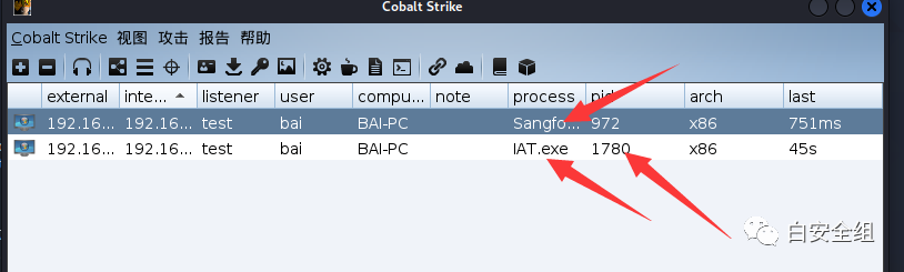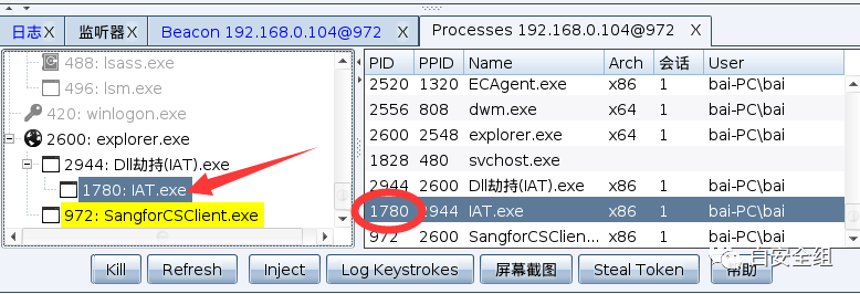 可以看到成功上线,最后我们做一下迁移,将木马迁移到其他的程序中,因为软件关闭可能导致我们木马掉线。